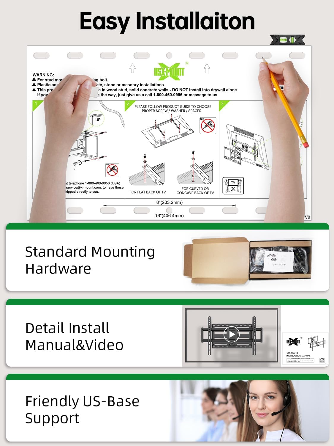 Equipped with dual swivel articulating tilt and 6 arms, this TV wall mount offers unparalleled flexibility and adjustability, allowing you to find the perfect viewing angle from anywhere in the room. Whether you’re hosting a movie night or catching up on your favorite TV show, the USX MOUNT Full Motion TV Wall Mount ensures a comfortable and immersive viewing experience every time.